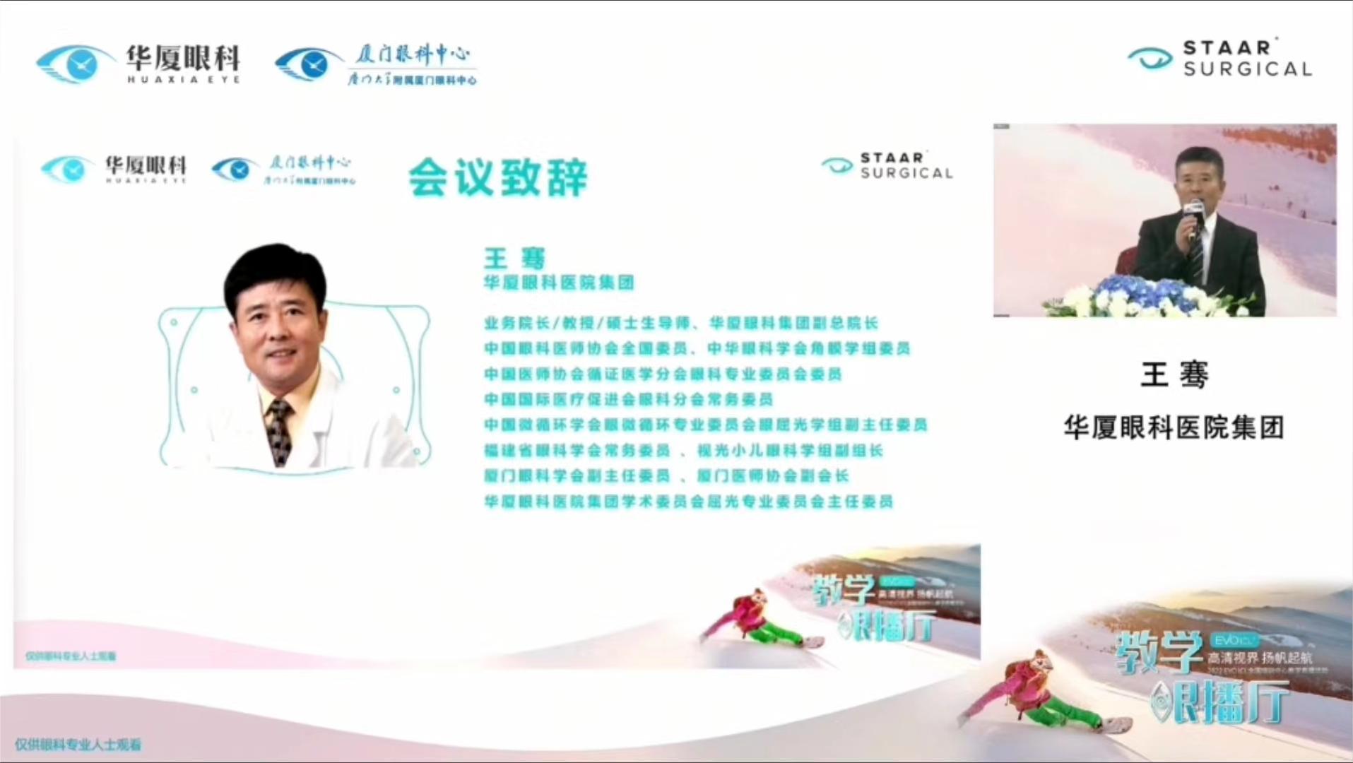 會(huì)議伊始,廈門眼科中心業(yè)務(wù)院長(zhǎng)王騫教授發(fā)表開場(chǎng)致辭。他提到,讓患者擁有高清視界,是我們每位眼科醫(yī)生追求的目標(biāo),希望通過教學(xué)眼播廳活動(dòng),將手術(shù)規(guī)范化、專業(yè)化,提高眼內(nèi)屈光手術(shù)醫(yī)生的專業(yè)素養(yǎng),為更多近視患者帶去福音。