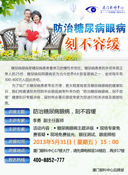 【文章導(dǎo)讀】【名醫(yī)講堂糖尿病眼病防治】5月31日,本周五,糖尿病眼病防治講堂將在廈門眼科中心17樓開講,所有受糖尿病眼病疾病困擾的患者,均可來參與聽講,期間也會免費(fèi)為所有人免費(fèi)驗光、