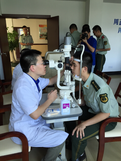 眼表與角膜病??聘敝魅味Z博士為官兵檢查眼睛