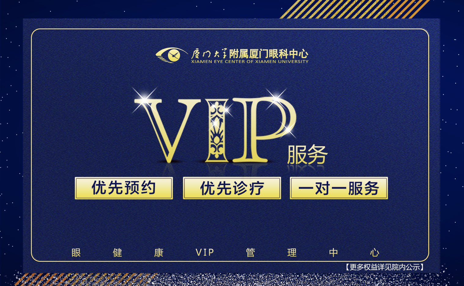 當(dāng)您成為眼健康VIP管理中心成員時(shí),廈門(mén)眼科中心眼健康VIP管家及時(shí)跟進(jìn)陪同導(dǎo)診。您將優(yōu)享眼健康醫(yī)療資源,快速完成您的眼健康診療項(xiàng)目,建立專(zhuān)屬您的個(gè)人眼健康檔案,尊享更豐富多元的眼健康權(quán)益!
