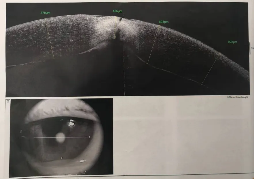 吳護(hù)平主任為小黃安排了詳細(xì)的檢查。經(jīng)過檢查,我們確認(rèn)了小黃為真菌性角膜潰瘍,在小黃角膜中央偏顳下方角膜上可以看到一個(gè)約2.2mm的類圓形的灰白色浸潤病灶,遮蓋了部分瞳孔區(qū),深度可達(dá)4/5角膜厚度,同時(shí)角膜上皮有缺損,基質(zhì)水腫,表面可以看見少量白色分泌物附著。