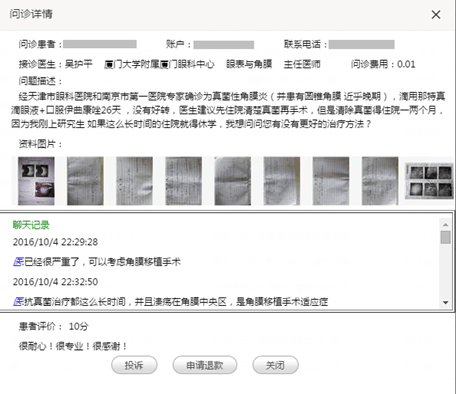 自10月20日眼科通啟動(dòng)“一元錢(qián)看名醫(yī)”眼健康公益行活動(dòng)以來(lái),每天接到來(lái)自各地近百個(gè)在線(xiàn)問(wèn)診。3歲的縣醫(yī)院基層患者小玲,北京、上海求醫(yī)無(wú)果的疑難病患小雷、青光眼性患者老劉……這些異地患者成為此次公益活動(dòng)的獲益者。
