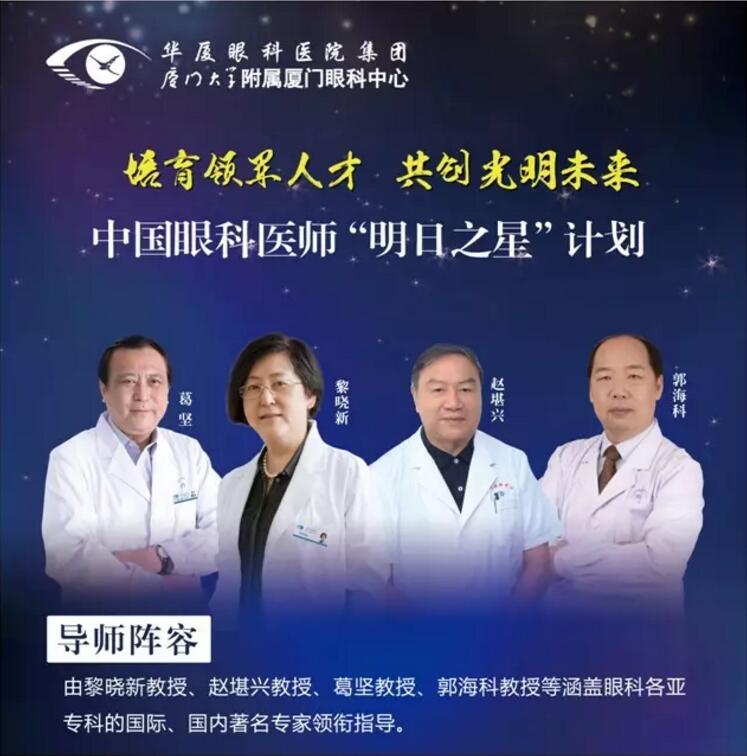 中國(guó)眼科醫(yī)師“明日之星”計(jì)劃由廈門大學(xué)附屬?gòu)B門眼科中心總院長(zhǎng)、國(guó)際眼科科學(xué)院院士、中華醫(yī)學(xué)會(huì)眼科學(xué)分會(huì)原主任委員、北京大學(xué)人民醫(yī)院原副院長(zhǎng)黎曉新教授,華廈眼科醫(yī)院集團(tuán)專家委員會(huì)主席、國(guó)際眼科科學(xué)院院士、亞太地區(qū)斜視與小兒眼科學(xué)會(huì)副主席、中華醫(yī)學(xué)會(huì)眼科學(xué)分會(huì)前任主任委員、中國(guó)醫(yī)師協(xié)會(huì)眼科醫(yī)師分會(huì)會(huì)長(zhǎng)趙堪興教授,華廈眼科醫(yī)院集團(tuán)戰(zhàn)略發(fā)展與學(xué)術(shù)委員會(huì)主任、中華醫(yī)學(xué)會(huì)眼科學(xué)分會(huì)名譽(yù)主任委員、原中山大學(xué)中山眼科中心主任暨眼科醫(yī)院院長(zhǎng)葛堅(jiān)教授,中華醫(yī)學(xué)會(huì)眼科學(xué)分會(huì)專家會(huì)員、華廈眼科醫(yī)院集團(tuán)業(yè)務(wù)副總院長(zhǎng)、廈門大學(xué)附屬?gòu)B門眼科中心業(yè)務(wù)院長(zhǎng)、上海和平眼科醫(yī)院院長(zhǎng)郭??平淌诘冉倜T士、博士研究生導(dǎo)師組成強(qiáng)大的導(dǎo)師陣容。