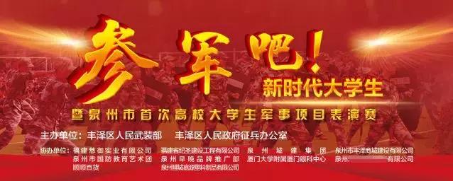 2019年5月25日,由泉州市豐澤區(qū)人民武裝部,豐澤區(qū)人民政府征兵辦公室主辦,廈門大學(xué)附屬廈門眼科中心協(xié)辦的《參軍吧!新時(shí)代大學(xué)生暨泉州市首次高校大學(xué)生軍事項(xiàng)目表演賽》在泉州市豐澤廣場舉行。表演賽吸引了泉州師范學(xué)院,泉州黎明職業(yè)大學(xué),福建電力職業(yè)技術(shù)學(xué)院,華僑大學(xué)等高校學(xué)生代表團(tuán),以及市民近千人,還有網(wǎng)絡(luò)、電視等130多家媒體通過現(xiàn)場直播或在線直播形式參加。