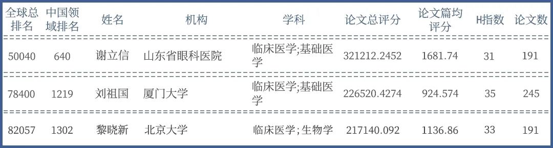 近日,全球?qū)W者庫網(wǎng)站公布了2022年“全球頂 尖前10萬科學(xué)家”榜單,27位中國眼科界專家學(xué)者進(jìn)入該榜單,在中國醫(yī)學(xué)界1799名入選者中占1.5%。其中,廈門眼科中心共有多位專家上榜,分別是廈門眼科中心總院長黎曉新教授、院長劉祖國教授,以及廈門眼科中心院士工作站謝立信院士。