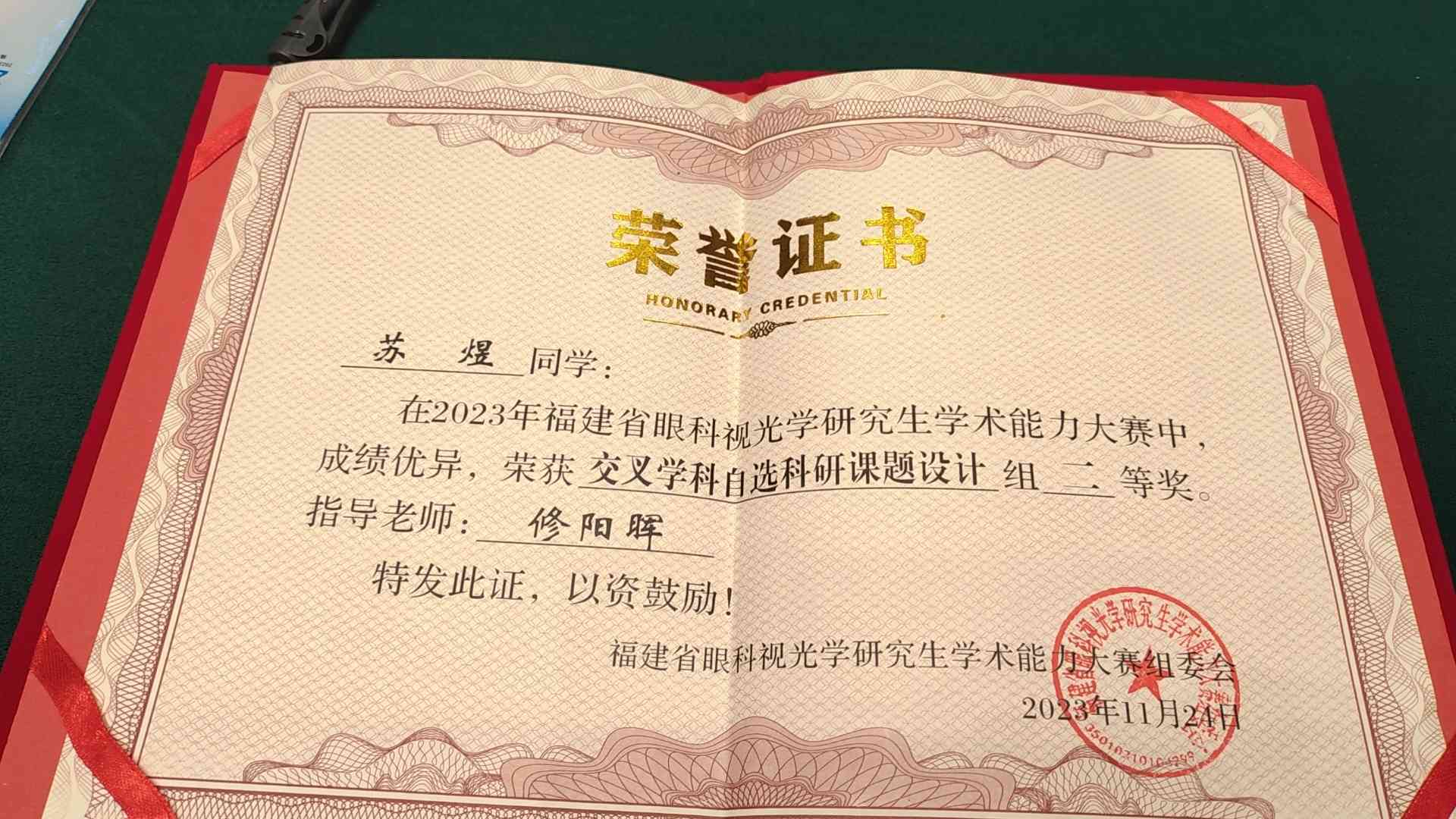 廈門眼科中心斜視與小兒眼病中心修陽暉博士指導(dǎo)的2023級專業(yè)型碩士研究生蘇煜代表廈門大學(xué)參賽,以嚴(yán)謹(jǐn)?shù)目蒲兴悸放c臨床思維,展現(xiàn)出良好的精神風(fēng)貌和綜合素質(zhì),獲得在場的專家評委一致好評,最終以總分全省第二的好成績斬獲“交叉學(xué)科自選課題組二等獎”。