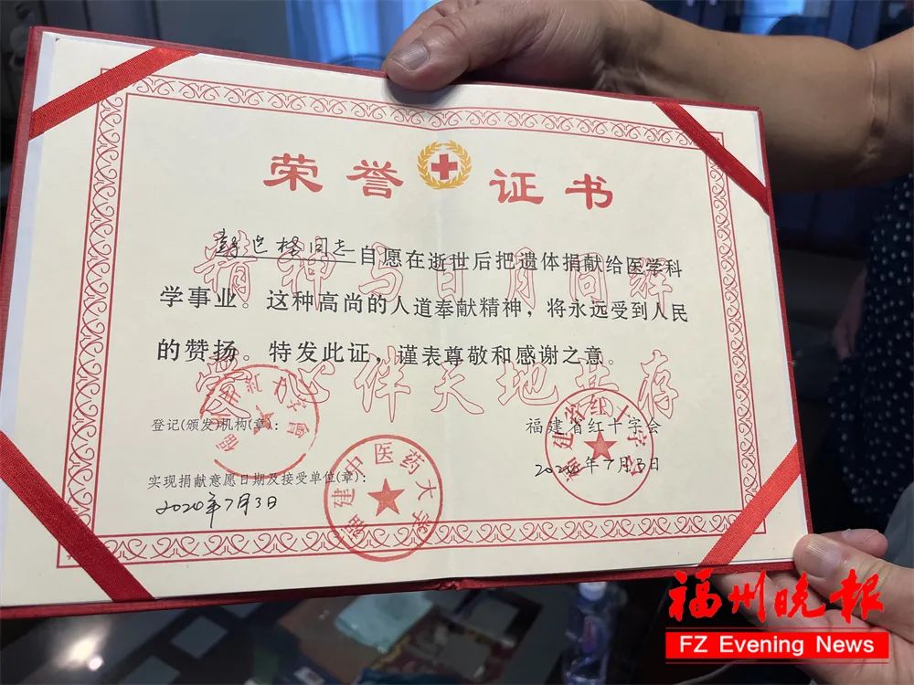 當(dāng)晚9時多,按照其遺愿,他如愿以償,捐獻(xiàn)有用的器官——眼角膜,并“坐”上開往福建中醫(yī)藥大學(xué)的車子,成為一名大體老師(醫(yī)學(xué)界對遺體捐贈者的尊稱)。